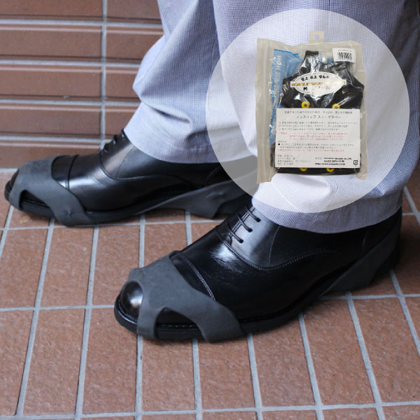 なお、氷上、雪上以外でのご使用は絶対におやめくださ 【使用方法】はじめにつま先部分の位置をあわせ、かかとに向かって引っ張りながら本品の端をかかと部分に引っかかるように装着してください。